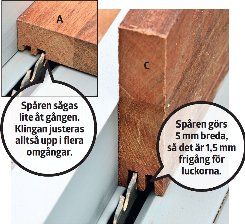 Sedan sågas spåren som de perforerade masonitluckorna ska sitta i.