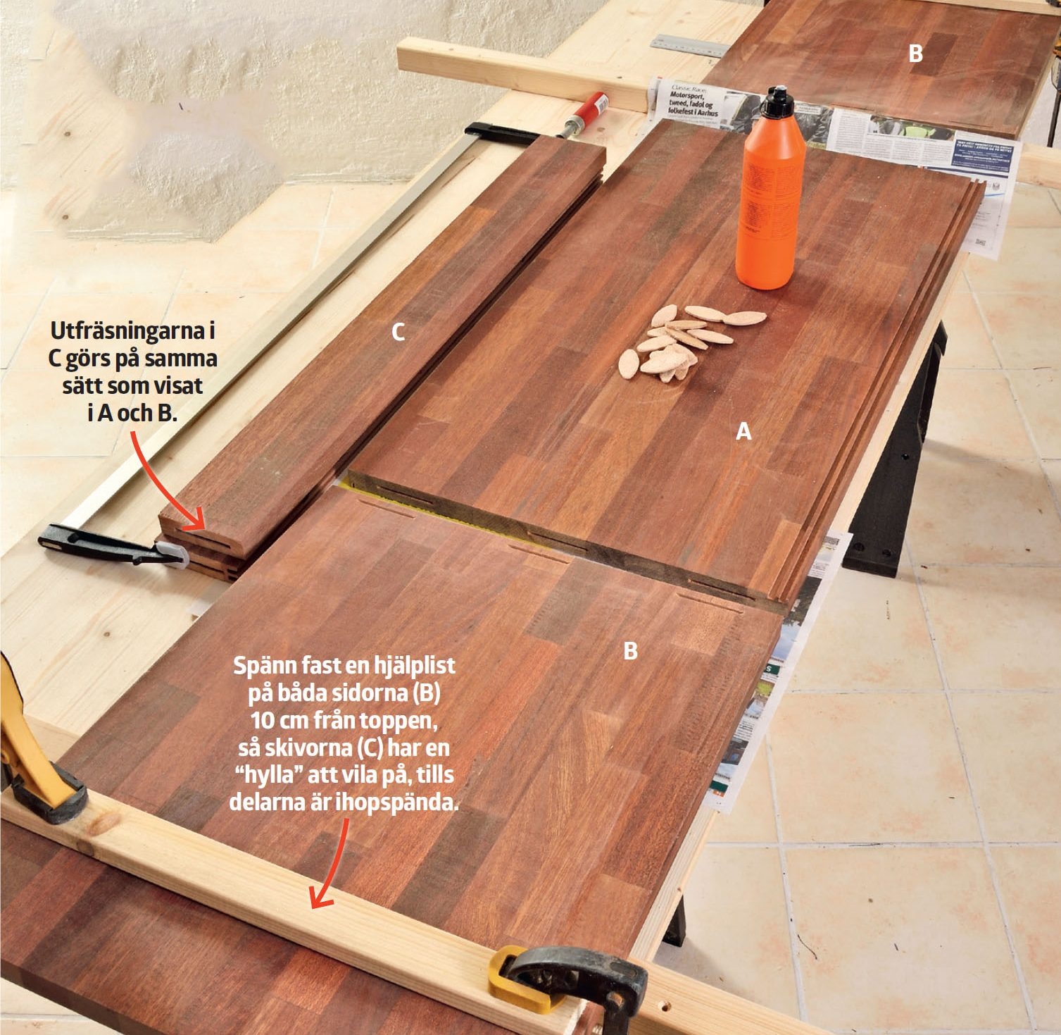 När du har fräst ut för alla lamellerna, är vi redo att montera skåpet. Lägg ut delarna så att du får överblick, och spänn fast hjälplister på sidostyckena (B).