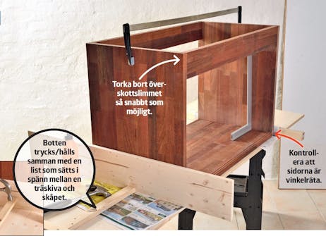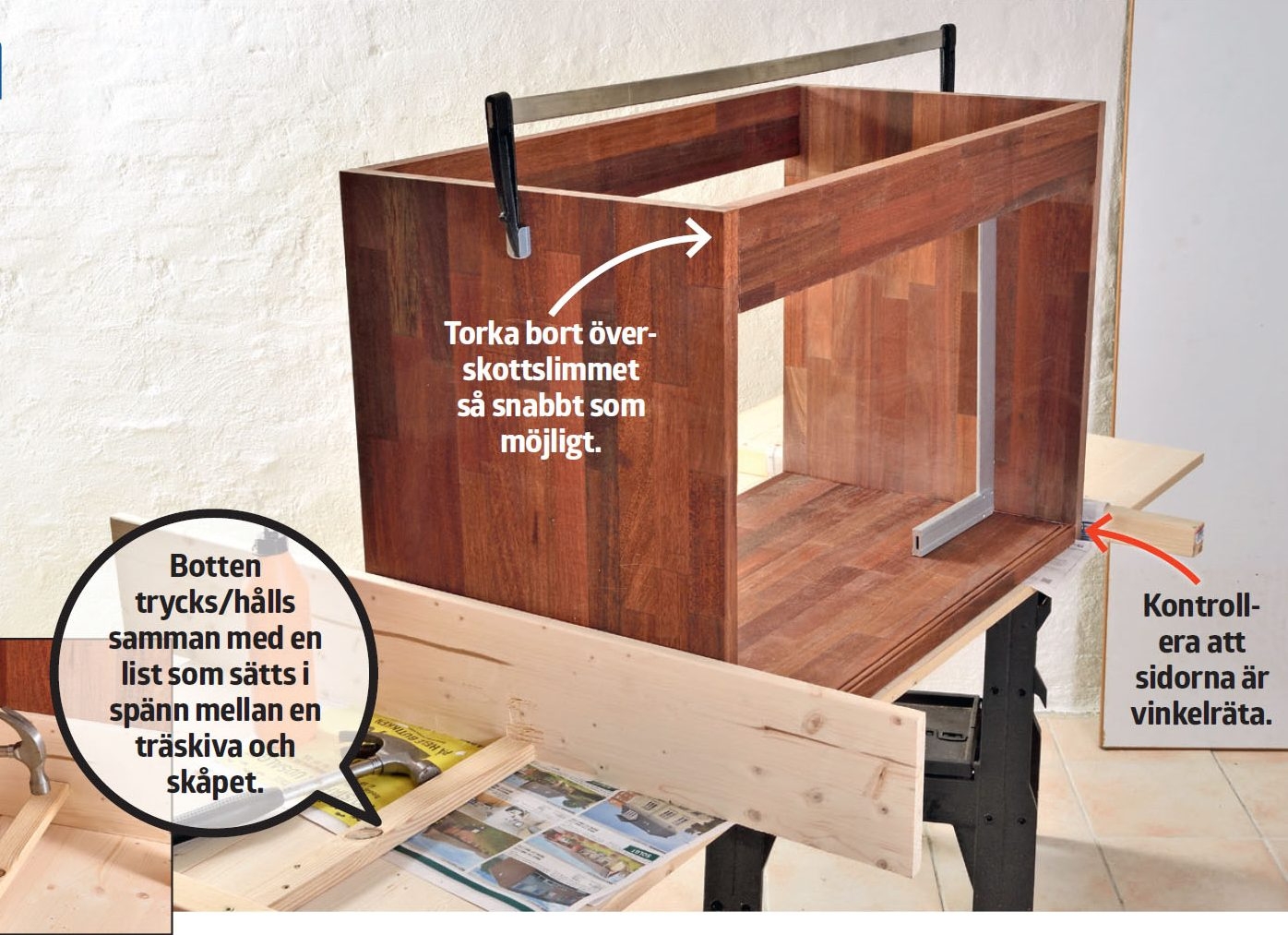 Skåpet spänns samman med hjälp av en skruvtving på toppen och en hemmagjord uppställning i botten. Se till att delarna är vinkelräta medan limmet torkar.