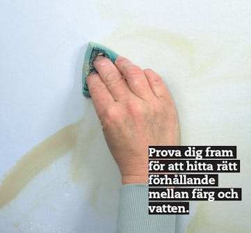 Fördela den sandfärgade färgen med en svamp och ev. också med en trasa så att den täcker lika mycket överallt. Svampen doppas hela tiden i rent vatten så att det blir lätt att fördela färgen. Vrid ur svampen lite så att det inte rinner vatten.