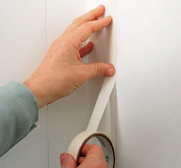 Måla vitt på utsidan av tejpen, alltså på den sida som senare ska vara blå. Syftet är att låta den färg som kan tränga in under tejpenska få lov att göra det. Det är detta lilla knep som gör att du får knivskarpa färgkanter.