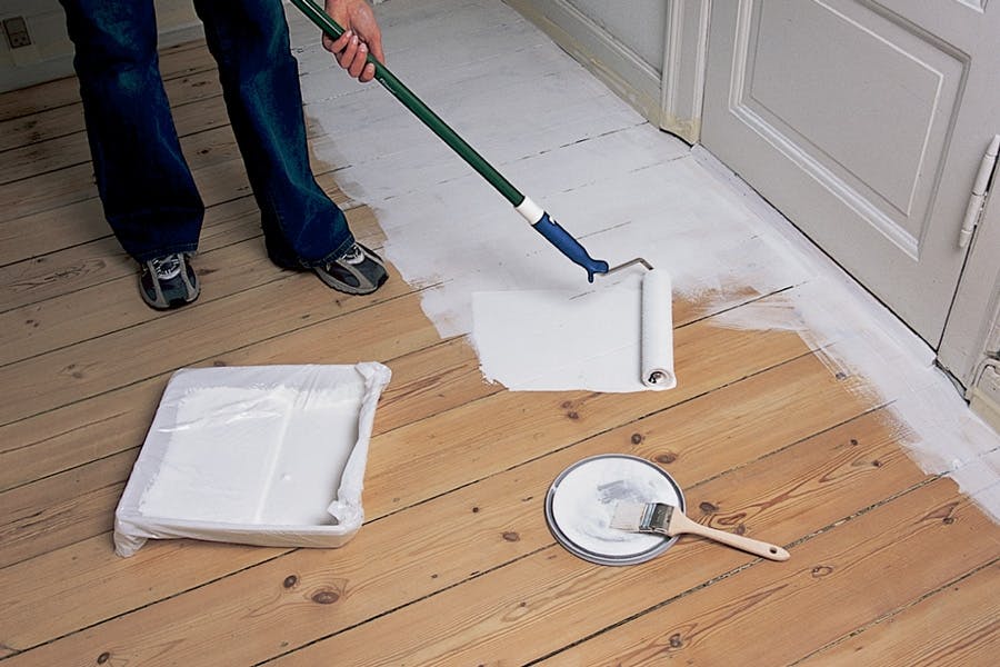 2. Färgen rullas på med en kortluggad roller i ett tunt lager. Börja i ena hörnet, och rulla på i ett raskt tempo i golvbrädornas längdriktning. Måla vått i vått, och se till att färgen täcker jämnt.