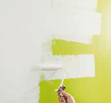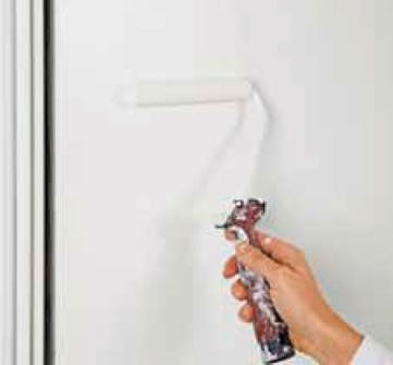 Rulla med mellanfärg som du har blandat av grundfärg och ytfärg i förhållandet 4:6. På naket trä hade vi börjat med grundfärg. Mellanfärgen ger dig ett bättre underlag och bidrar till att ytfärgen får mer glans.
