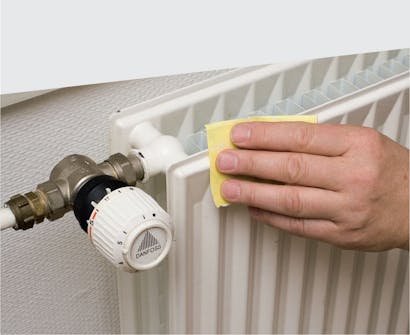 Tvätta radiatorn med målartvätt. Se till att komma in i alla falsar. Om det finns repor i ytan slipar du dem med fint slippapper (korn 150). Du ska ev. spackla för du kan inte dölja repor eller jack genom att måla med sprayfärg.