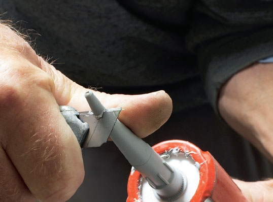 Spetsen på fogpatronen är konisk, och det innebär att ju längre in på den du skär, desto större öppning får du. Men det är bäst att öppningen i spetsen är lika stor som fogens bredd. Om du skär av spetsen snett får du bra arbetsvinkel och möjlighet att variera bredden genom att vrida fogpistolen lite åt sidan.
