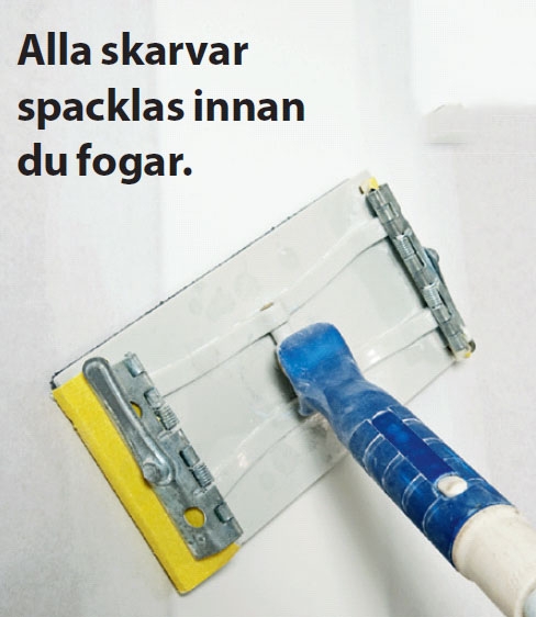 Även om du i denna artikel får världens bästa fog-tips så kan du inte läsa dig till ett handlag. Det kräver övning. Om du inte har det, är det klokt att täcka över och maskera noga innan du fogar. Maskeringstejpen ska pressas fast ordentligt, och den ska tas bort genast efter fogning och innan massan härdar.
