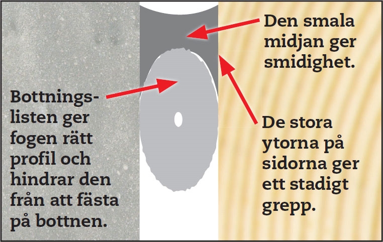 Fogar mellan två föremål, som rör sig i förhållande till varandra, kan hålla tätt endast om de kan ge sig i bredd utan att förlora greppet på sidorna. Och det räcker inte att materialet är elastiskt. Fogens tvärprofil betyder allt för att den ska kunna utnyttja materialets elasticitet. Fogen ska byggas upp så att den är tunn på mitten och därför smidig. Men den ska vara tjock längs sidorna för att fästa ordentligt. Fogen får inte sitta fast på bottnen för då släpper den snart greppet på ena eller båda sidorna. En riktigt elastisk fog bygger du därför upp mot en bottningslist av slät skumplast. Den ska dels täcka bottnen, dels ge fogen en smal och smidig midja på mitten och breda sidor.