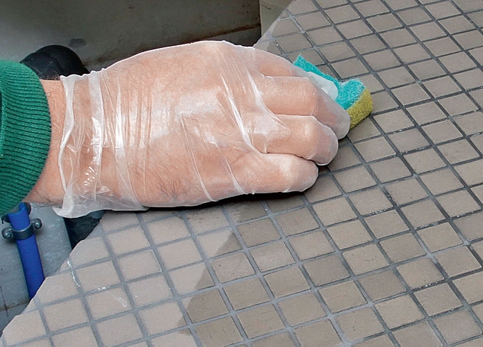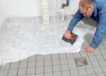 Ett enkelt sätt att maskera vid gummifogning är att spruta lite diskvatten på området. Men först när du har fyllt hela fogen! Sidorna i fogen får absolut inte blir våta. När du sedan slätar ut 14 medfogstickan hindrar vattnet massan från att fastna på fel ställen. OBS! Ej för akrylfogning!
