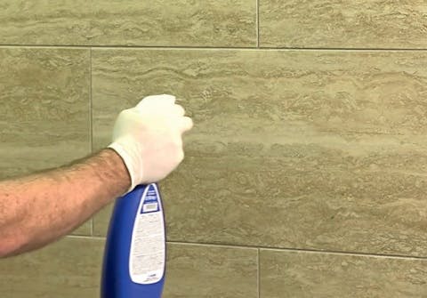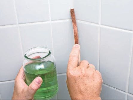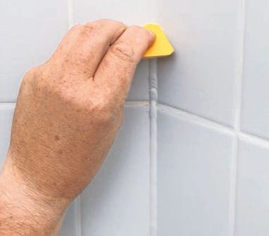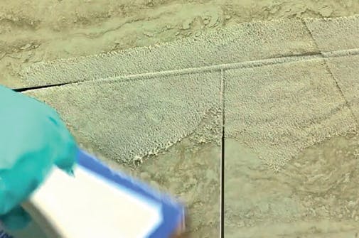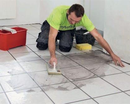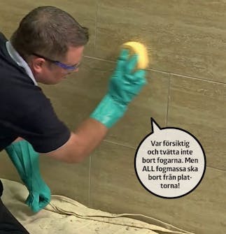 Stryk på fogmassan med en fogbräda. Se till att pressa ner massan ordentligt i alla fogar - vänd och vrid fogbrädan som det passar. Dra av överflödig fogmassa från plattorna med diagonala rörelser, så att så lite som möjligt behöver tvättas bort.
