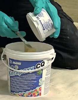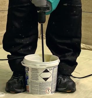 Rör ihop massan i 4-5 minuter med hjälp av en visp på borrmaskinen. Konsistensen är lite tjockare än den cementbaserade fogmassan.