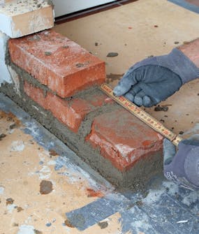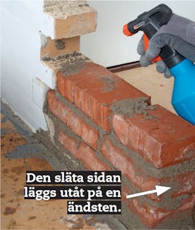 När du sedan murar är det smart att först fukta tegelstenarna. Då fastnar bruket bättre och torkar inte så snabbt. Då får du lite längre tid på dig att justera dem. Börja nerifrån och kolla både nivån och riktningen i takt med att du murar.
