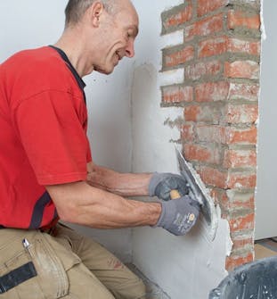 Här putsar vi väggen med ett tunt lager fästmassa.