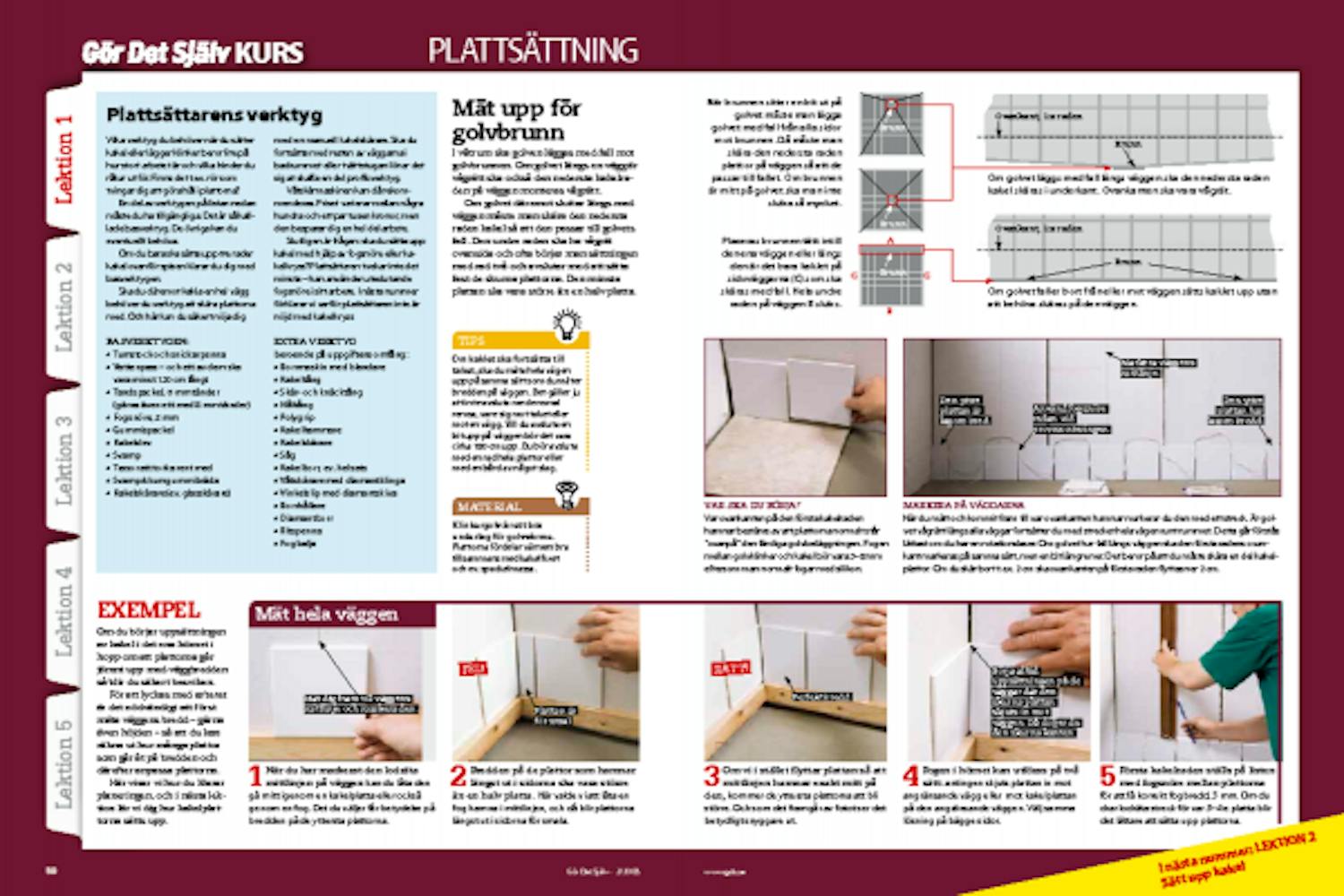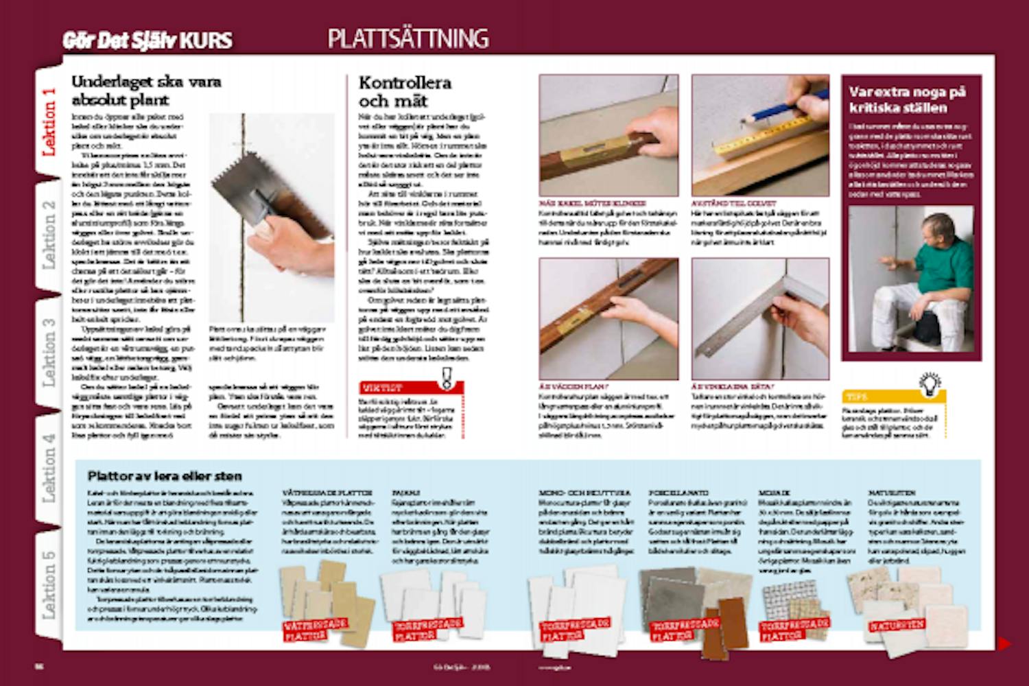 Du kan själv välja om du vill sätta upp vita plattor i rad efter rad eller om du vill ha diagonala mönster, bårder eller olika kulörer på plattorna. Och vi talar inte bara om väggar. Plattsättningens konst gäller även för läggning av klinkergolv. När du blivit förtrogen med tekniken klarar du alla arbeten.