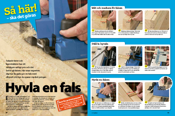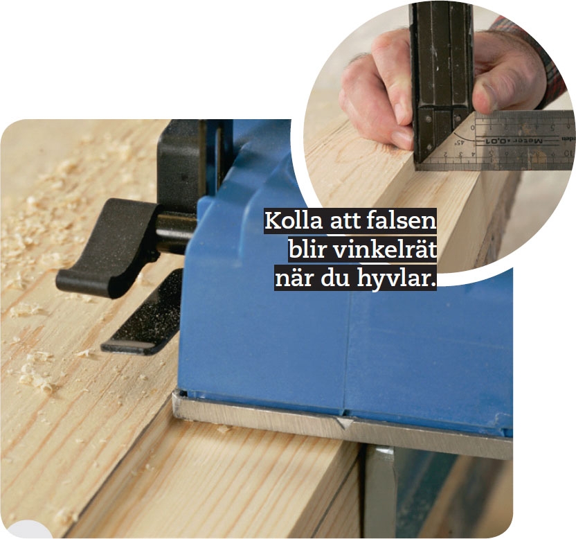 Kolla att falsbredden är den rätta. Det ska göras så snart du har hyvlat bort en millimeter. Om falsen inte har önskad bredd justerar du med parallellanslaget.