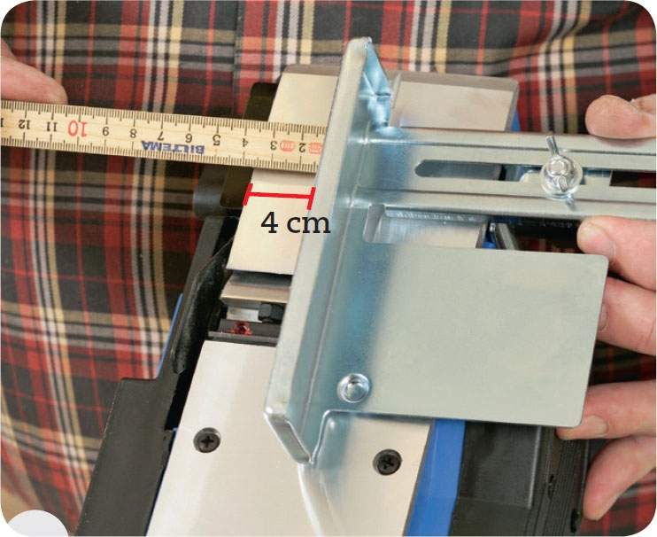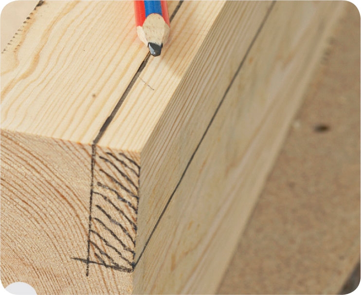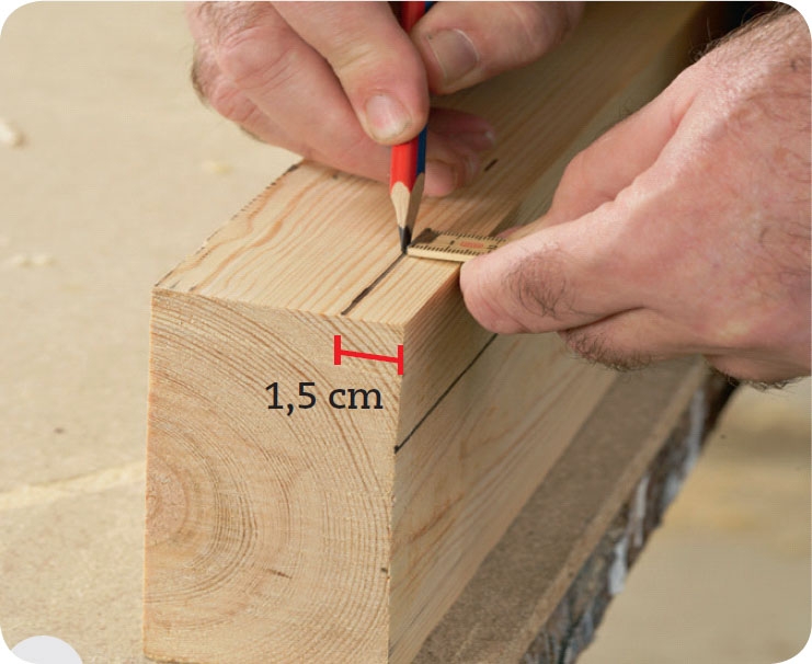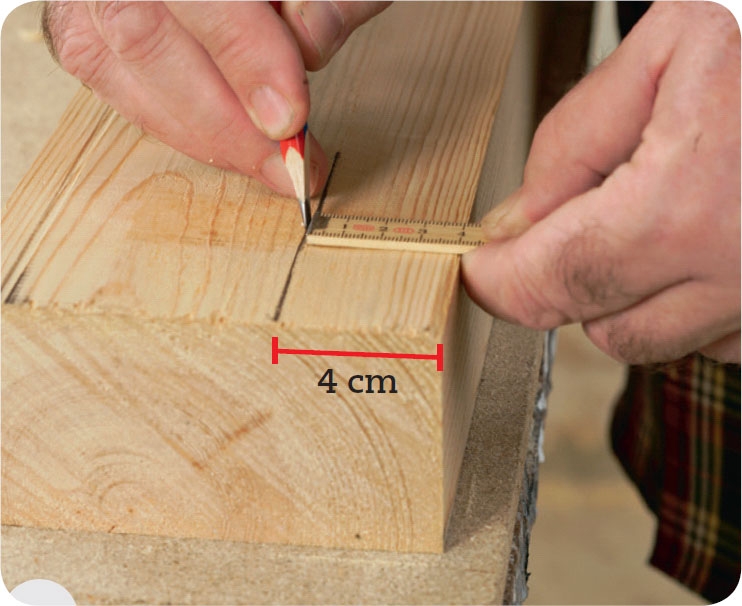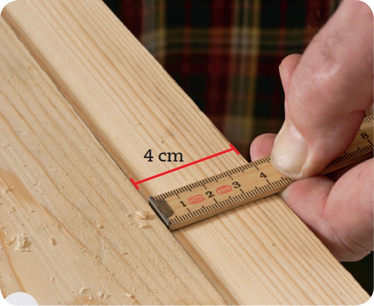 Markera falsens bredd på listen eller regeln. Här ska den vara 4 cm. För att få en perfekt fals måste träet ha räta vinklar.