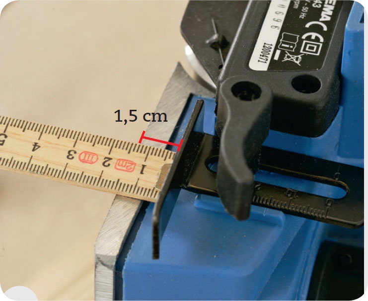 Hyvla bort en millimeter av träet när du har ställt in elhyvelns spåntjocklek på 0,5 mm. Kolla att parallellanslaget följer träet och håll hela tiden hyvel vågrätt.