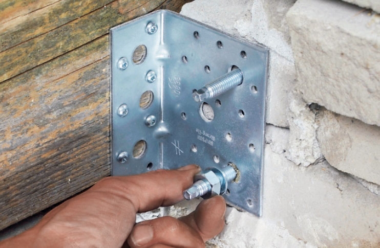 Ingenjören ansåg först att vi inte behövde fästa avväxlingen på väggen. Men vi kom sedan fram till att det alltid är klokt att gardera sig, så därför monterar vi ett vinkelbeslag även mellan bjälken och väggen. Det är inte lika stort som det vinkelbeslag som användes mot bjälken C.