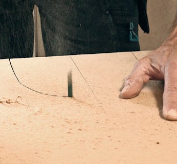 Ska du kapa en skiva med sänksåg och styrskena är det viktigt att skenan ligger riktigt stadigt. Därför bör du se till att skenan har stöd undertill, om den är längre än skivan. Det kan göras med en extra bit av en skiva som är lika tjock.