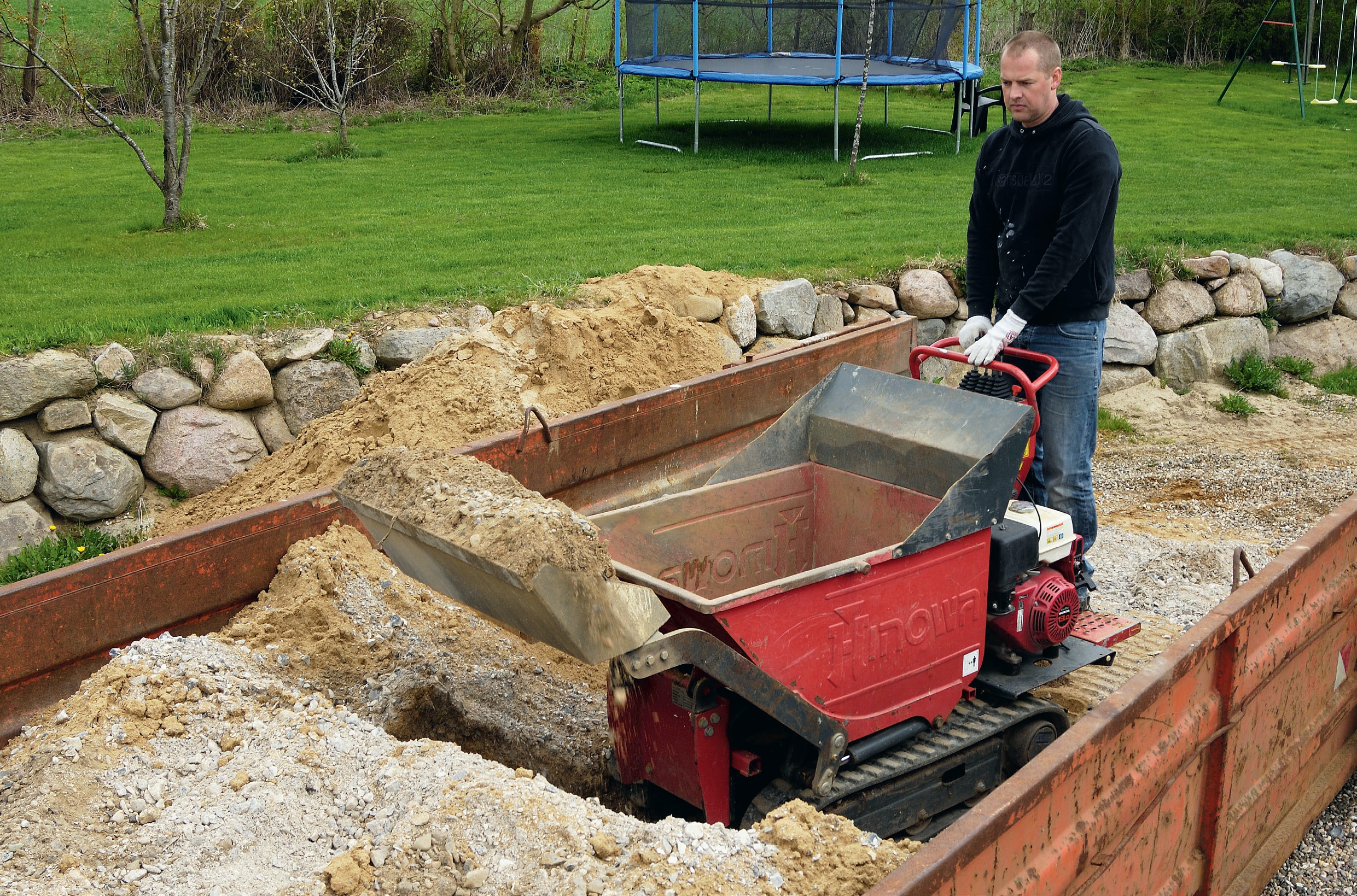 Du sparar tid, skonar ryggen och gör det lätt för dig om du hyr en motoriserad skottkärra, gärna en med skopa.
