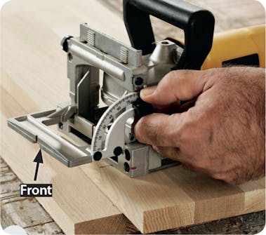 Fäll ner fronten på lamellfräsen. Ställ in den på 90 grader för den ska användas att styra fräsen med.
