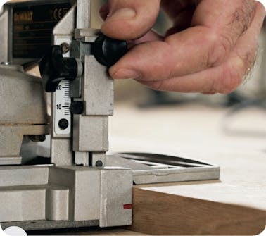 Ställ in fräshöjden. Här fräser vi in kexet mitt på skivkanten. Det är inte nödvändigt att hamna exakt mitt på så länge du fräser på exakt samma höjd i de två skivkanterna.