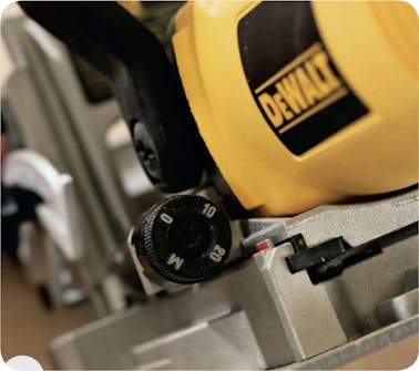 Placera fräsen så att mittenmärket hamnar vid strecket. Starta fräsen och pressa in klingan i träet. Så snart du minskar trycket glider klingan in i maskinen igen. Fräs urtag i båda skivorna.