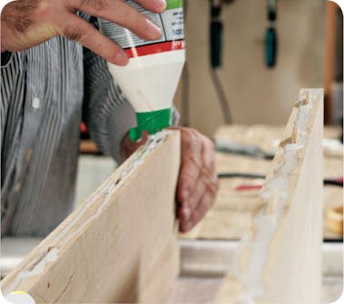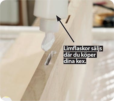 Lägg rikligt med lim på kanterna. Snåla inte på limmet. Du ska lägga på så mycket att limmet pressas ut ur fogen när skivorna trycks ihop.