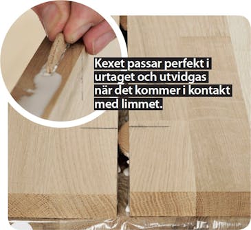 Sätt ett kex i varje fräst urtag. Det går lättare att trycka ihop de två skivorna om du sätter kexet mitt i urtaget.