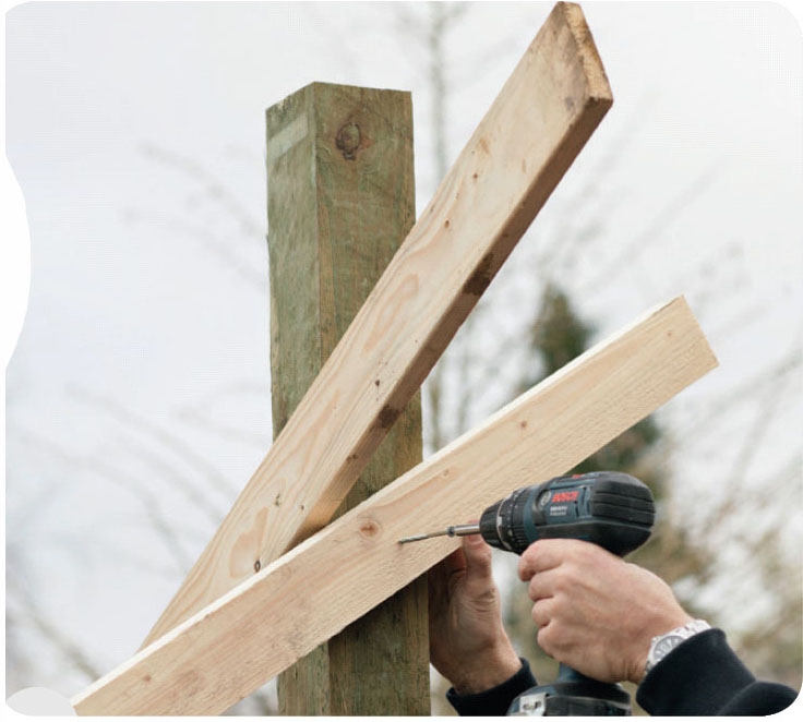 Fixera stolparna. Det är alltid praktiskt att fixera stolparna med ett par brädor för att de ska stå stadigt. Några av brädorna fästs som snedsträvor mot marken.