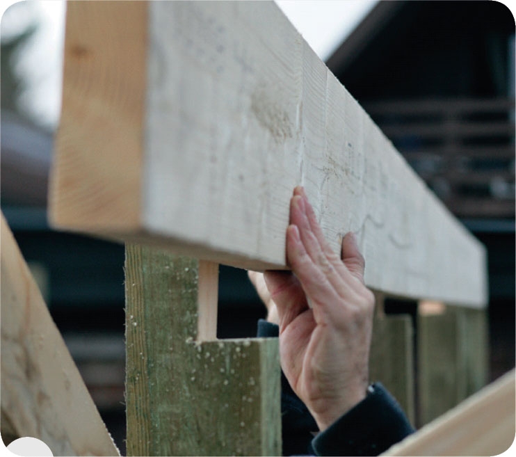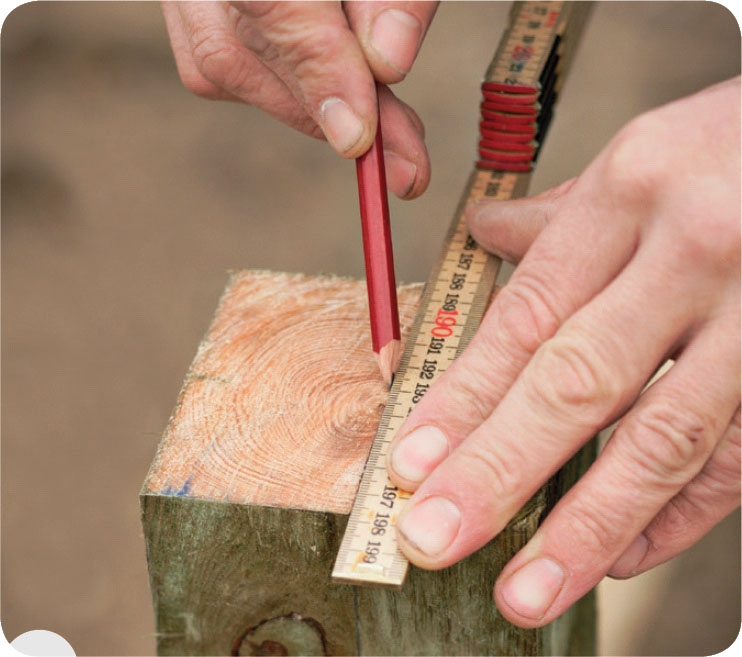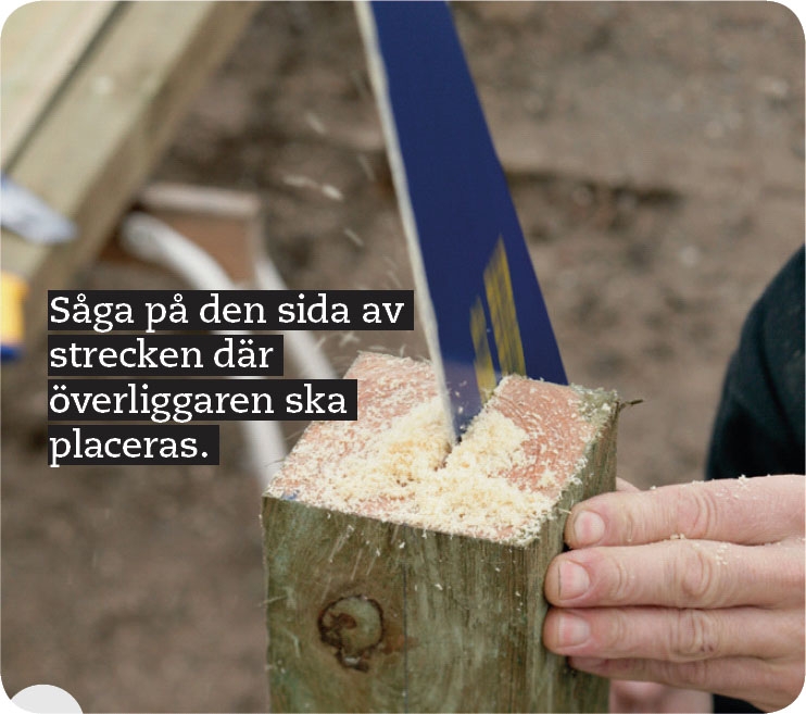 Markera sågspår för överliggaren. Här är överliggaren 45 mm bred och måttet markeras på ovansidan av stolparna.