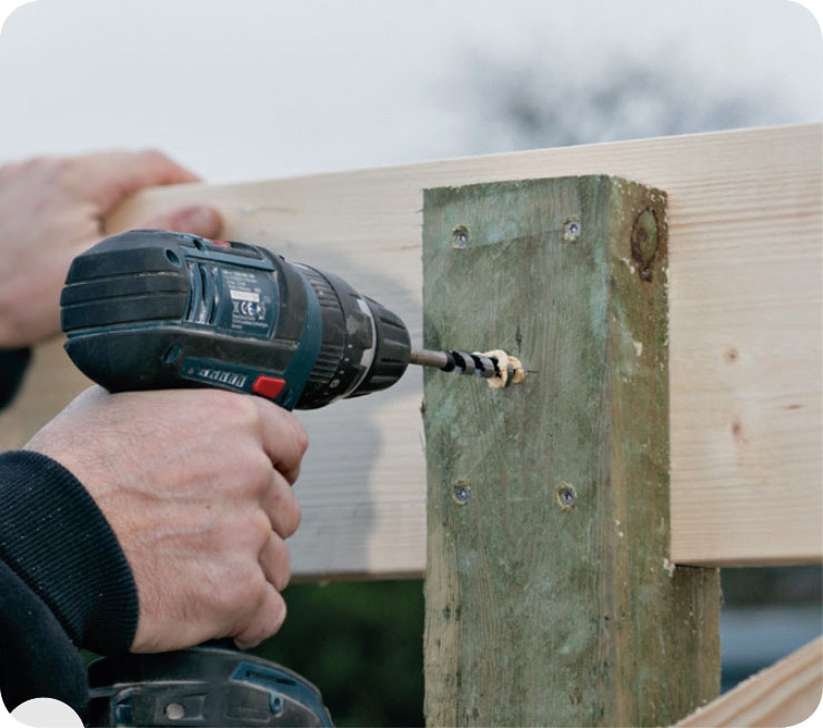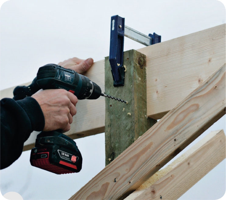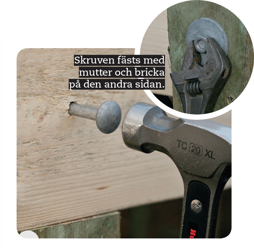 Borra fyra hål genom stolpen och in i överliggaren. Gör två hål upptill och två nertill med 6 mm borr. Fäst därefter 5 x 90 mm skruvar i hålen.