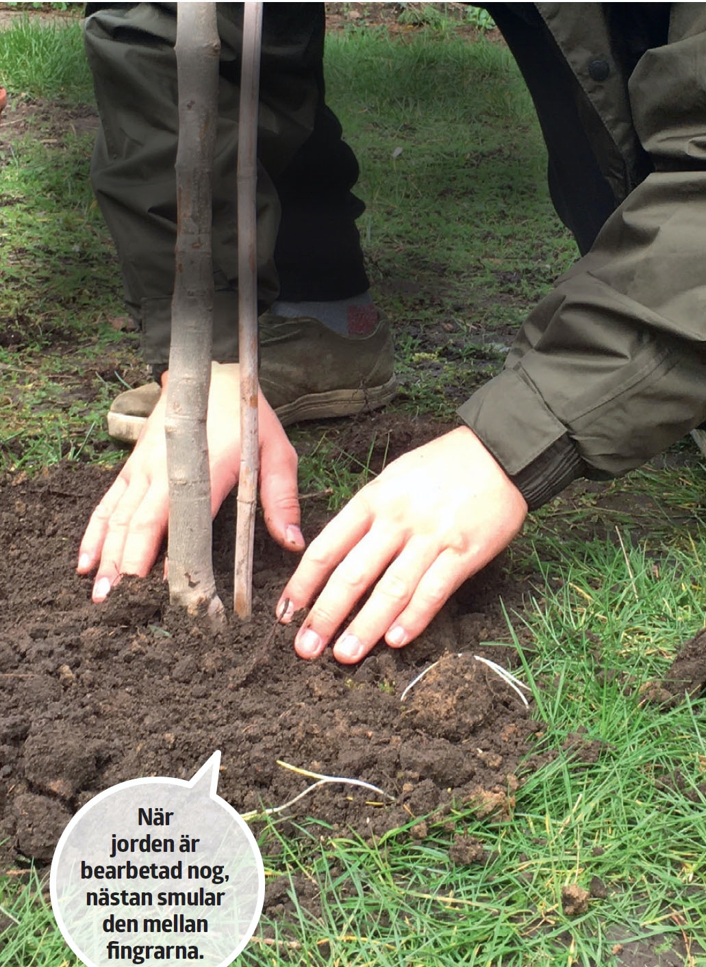 Istället för att ta sats från granntomten och trycka till jorden runt ditt nyplanterade träd så hårt som möjligt, är det bättre att bearbeta jorden i gropen så att den blir lös och dränerad. Det är nämligen viktigt att jorden inte är för kompakt, så att vattnet rinner undan. Jorden bearbetas i all sin enkelhet genom att trycka ner en grep och därefter vicka den fram och tillbaka, tills du märker att den släpper lite. Om jorden har mycket lera, kan du dränera genom att lägga lecakulor i botten, så att rötterna inte blir för blöta.