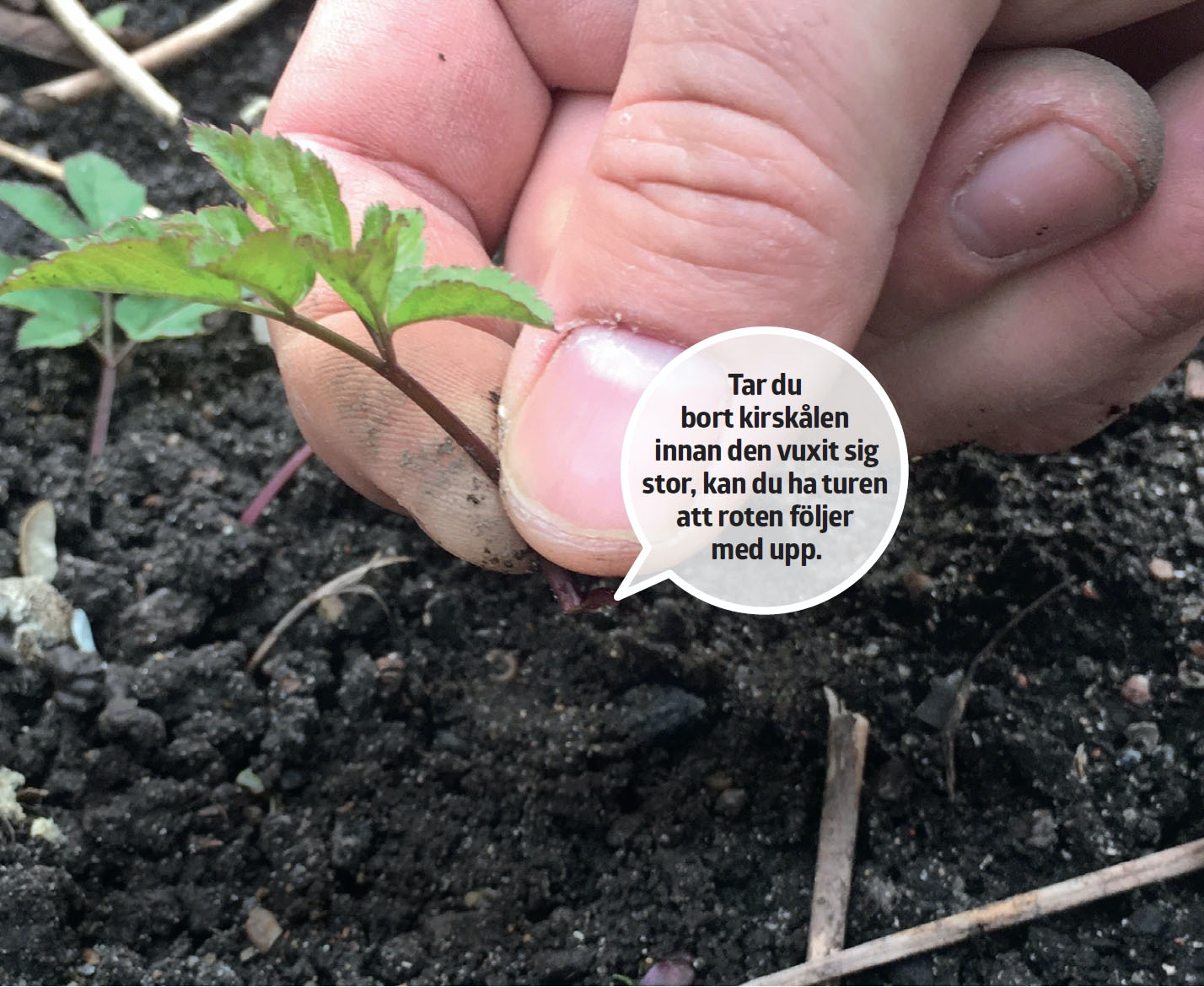 Orkar du inte göra det, kan du nöja dig med att ta bort den del av kirskålen som sticker upp ur marken. Det hämmar plantans tillväxt och ser till så att den inte breder ut sig så mycket och inte fröar av sig.