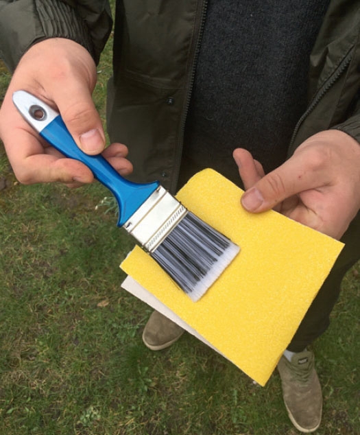 Nya penslar har ofta lösa borst som lätt fastnar i färgen. Innan du börjar använda penseln, kan du med fördel stryka den mot en bit grovt sandpapper. Tryck, stryk och vänd på penseln några gånger. Då kommer sandpappret efterhand att dra ut de lösa stråna.