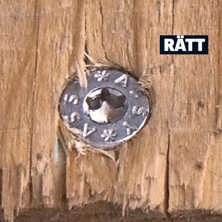 Väljer du synliga skruvar i trallbrä-dorna, bör du ta dig tid att förborra och att försänka skruvhuvudena. Skruvar du direkt i brädorna, är risken att skruvarna förstör träets fibrer och bildar sprickor som ger träet möjlighet att suga upp vatten som en svamp. Hålet ska vara så stort att skruven sluter tätt längs sidorna, och skruvhuvudet ska hamna i jämnhöjd med trallbrädorna eller sticka upp 1-2 mm. Viktigast är att skruvhuvudena inte hamnar lägre, för då bildas det en liten sjö av vatten på varje skruv.