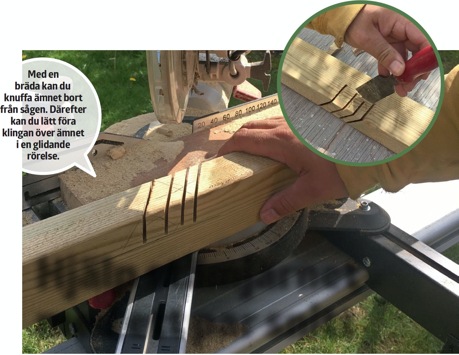 Ska du stämma ut ett “kryss” i staketet eller till en solid snickerifog, är det ett tufft arbete om du bara har hammare och stämjärn tillhands. Visst har metoden fungerat i århundraden, men varför inte öka farten och precisionen med en kap-/gersåg? Genom att göra 4-5 snitt som är lika djupa kan du snabbt stämma bort det överflödiga träet. Och inte nog med det: Kapsågen gör det möjligt att tack vare sin precision få till spikraka snitt, så att du kan få fogarna att passa helt perfekt - om du mäter och markerar ordentligt, naturligtvis!