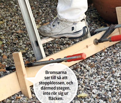 Det kan vara nervkittlande, och oansvarig säger en del, att rensa hängrännor utan att någon håller i stegen. Om du arbetar ensam, bör du därför bygga en “stoppkloss” till stegen, som består av en bräda monterad på två bitar läkt eller regel, som fungerar som broms. Själva anordningen spänns fast vid stegen med två rejäla skruvtvingar. Därefter kan du i lugn och ro ta en runda upp till hängrännan.