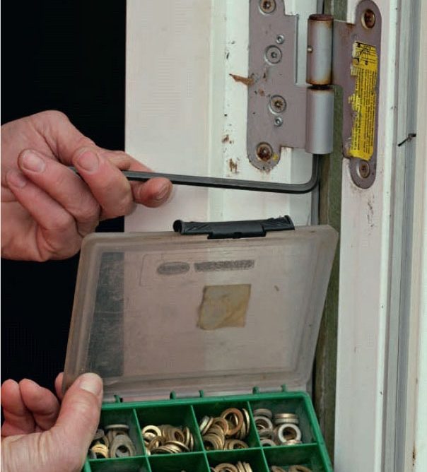 Har du en nyare dörr, kan dörren rättas upp genom att du justerar de skruvar som sitter på gångjärnet - vanligtvis små ställskruvar - och de fyra skruvar som själva gångjärnet sitter uppe med.