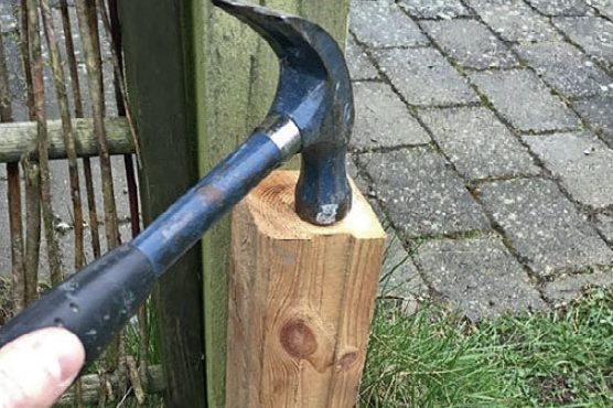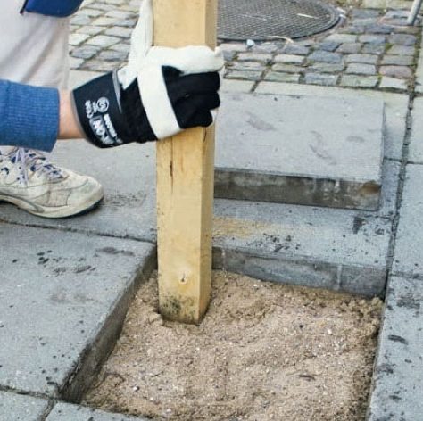 Lägg sättsand i hålet och packa det genom att stampa ordentligt med en tung stolpe eller liknande.