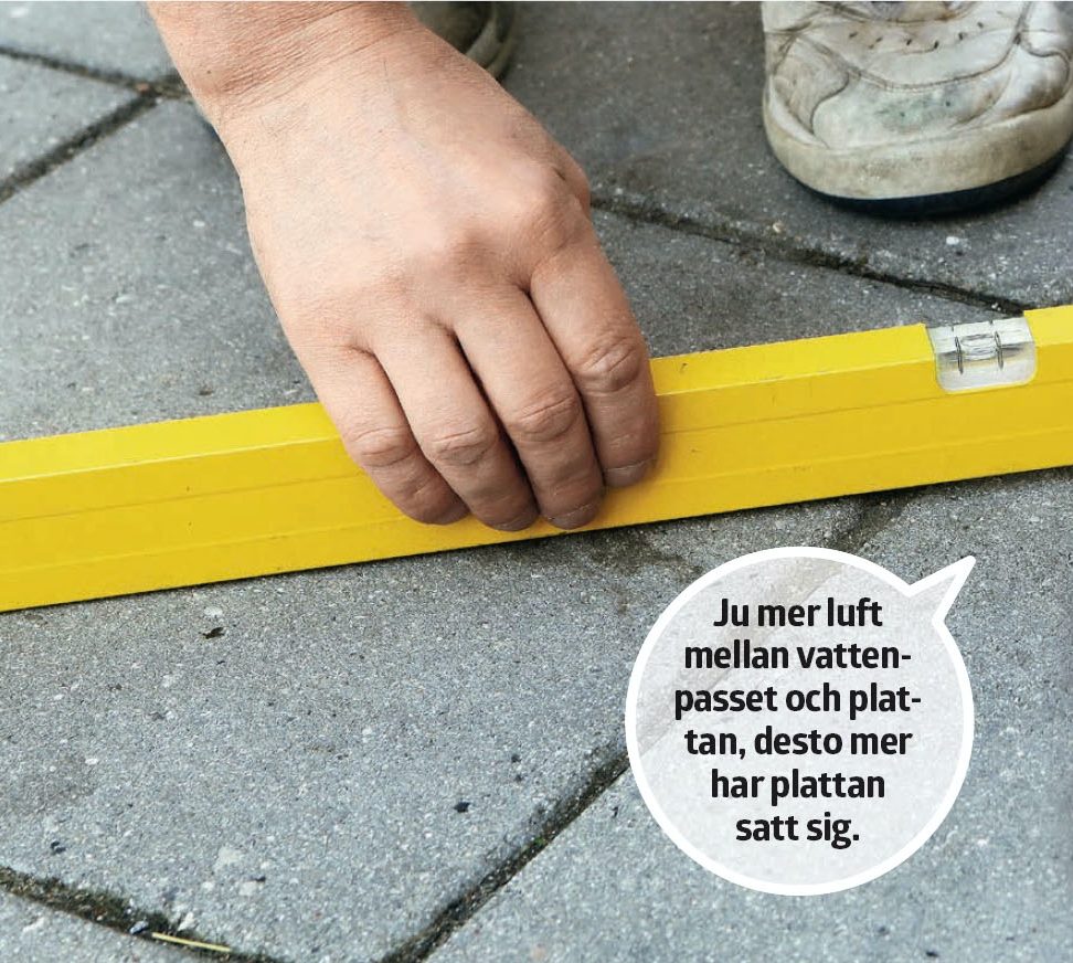 Hitta de plattor som satt sig med hjälp av ett vattenpass. Avståndet från den nedsjunkna plattans ovandel till vattenpassets undersida, ger en indikation på hur mycket sättsand som behövs.
