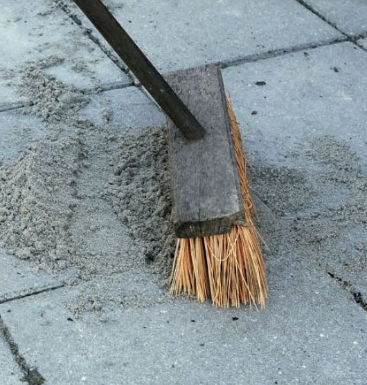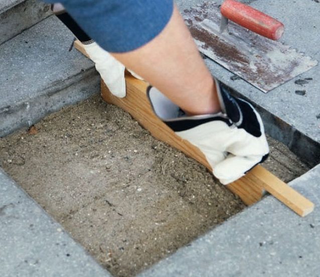 Jämna till sättsanden med en bräda, som är tillsågad så att den passar i hålet och är i jämnhöjd med plattan. Ligger plattan fortfarande för lågt, måste du fylla på med ett extra lager sand.