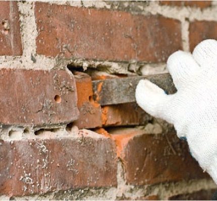 Hugg ut tegelstenarna med en mejsel. Fräs eventuellt först runt stenarna med vinkelslip med en fogfrässats, om de sitter rejält fast. Se till att inte skada de omkringliggande stenarna. Rengör hålet och fukta det med en våt kvast.