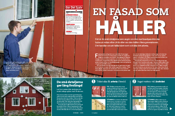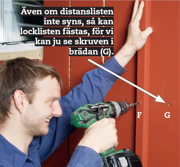 Träet ska ha chans att arbeta i sidled i fuktigt och torrt väder. Här är det lätt, för vi sätter fast locklisterna med en skruv mitt emellan två fasadbrädor, och varje bräda fästs med en skruv på mitten.