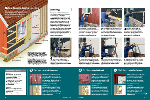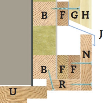 Om fasadbrädorna inte hade varit så illa åtgångna kunde vi ha nöjt oss med att ta bort locklisterna, för då hade vi fått en plan yta att arbeta på. Men nu, när vi ändå ska sätta upp helt ny lockpanel, passar vi på att tilläggsisolera med 45 mm mineralull och vi kompletterar med ny vindpapp. Den gamla kan sitta kvar för den håller tätt utan att göra någon skada. Den utvändiga tilläggsisoleringen gör att fönster och dörrar hamnar djupare i fasaden och att taksprånget minskar. Vi sätter därför lister (R) runt fönstren och ett nytt fönsterbleck (K).