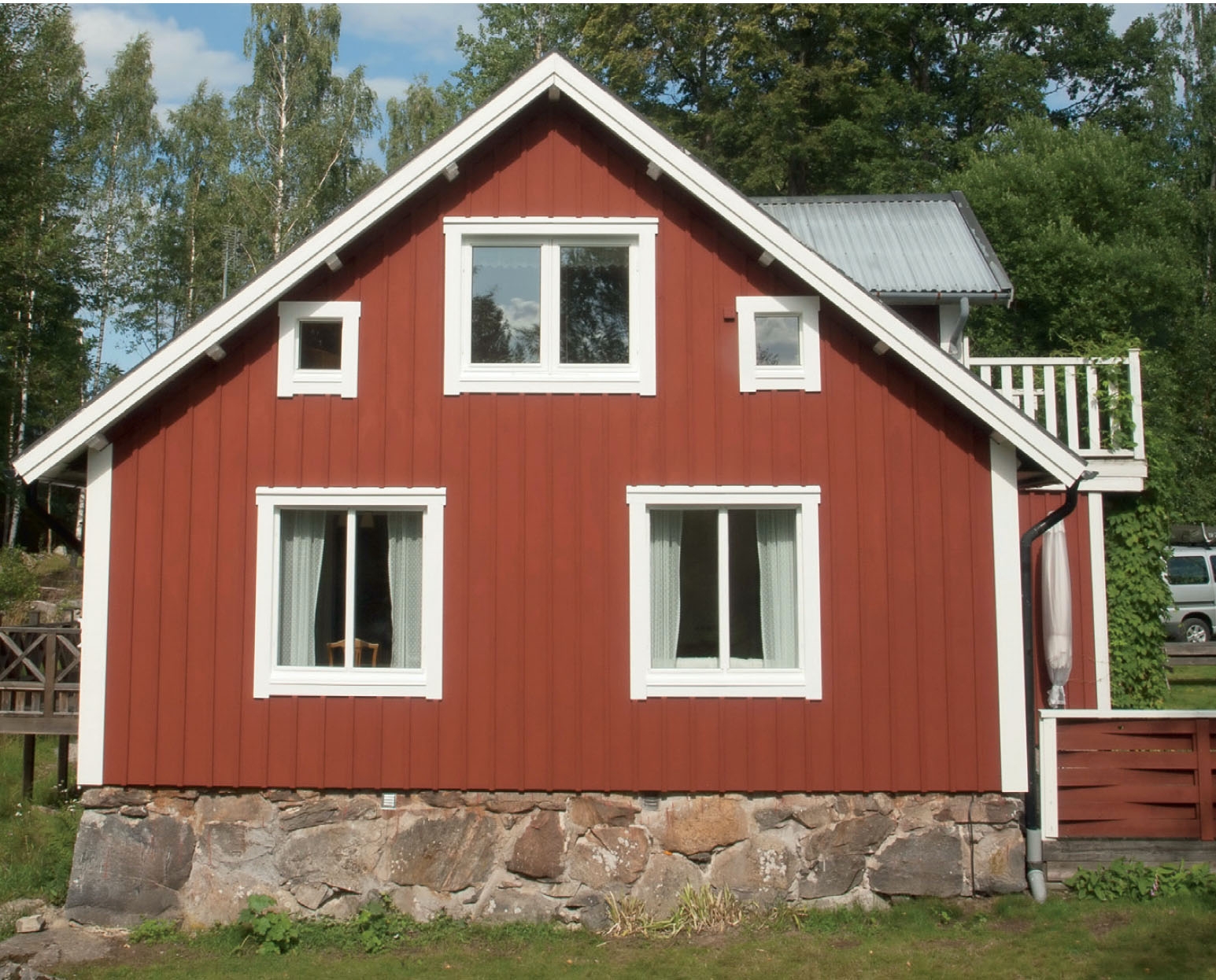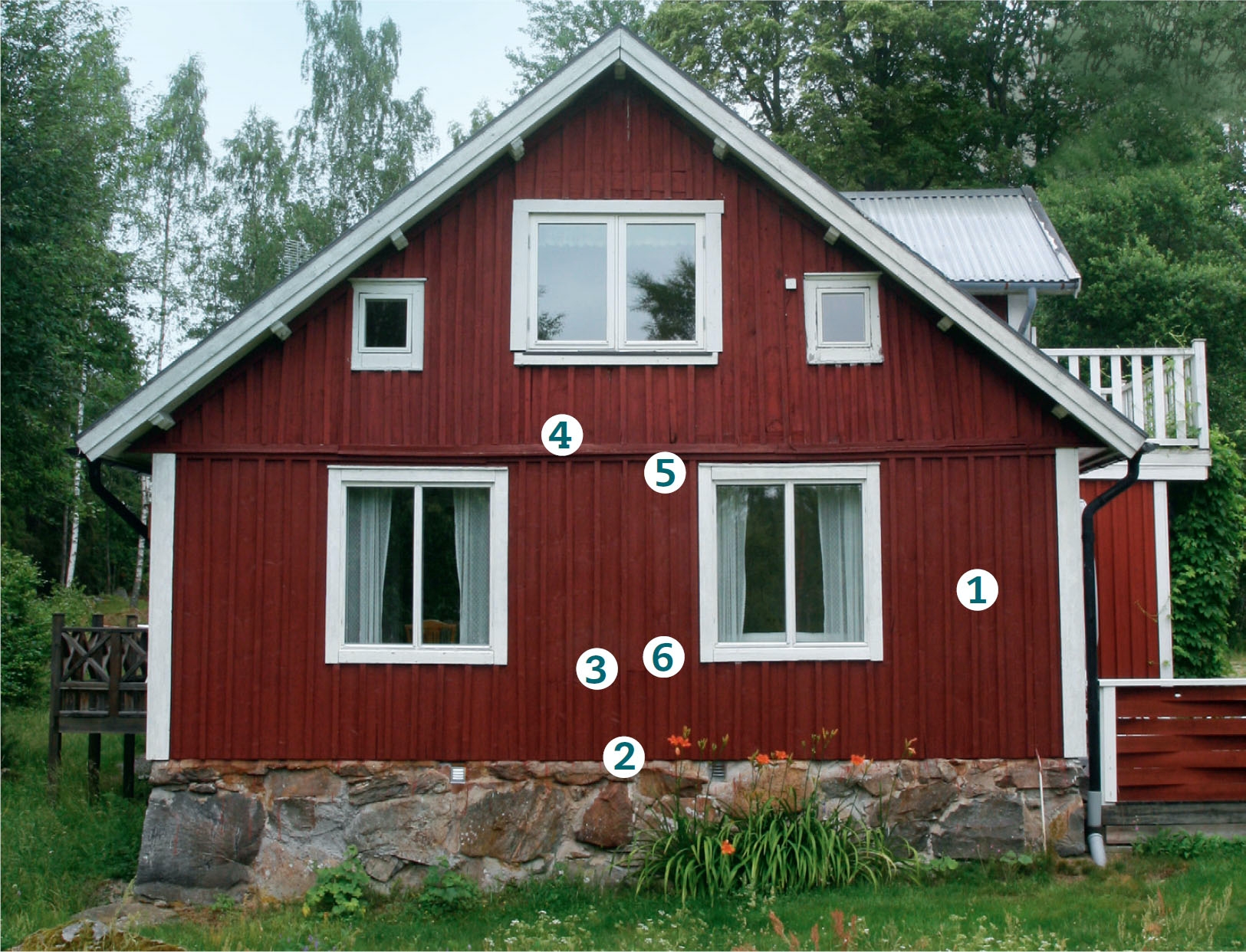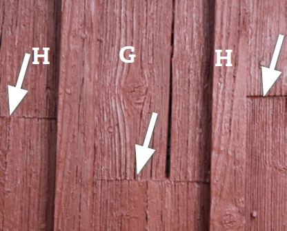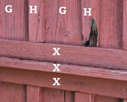 FEL 4: För att kunna använda korta, billigare brädor, har gaveln delats av ett vågrätt band bestående av tre brädor (X). Det kan också vara snyggt att se på, men här har arbetet utförts fel, för regnet tränger in bakom både lock (H) och brädor (G).