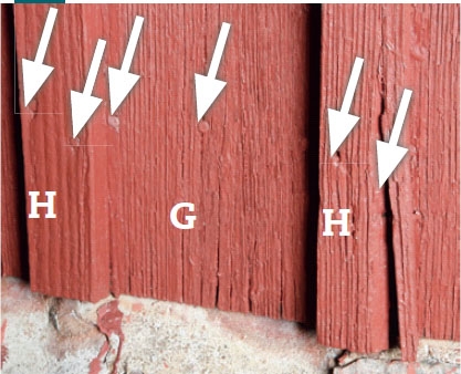 FEL 3: Där en fasadbräda (G) inte är tillräckligt lång har den skarvats med vinkelrät kortände mot en annan bräda. En sådan skarv suger åt sig regnvatten som läskpapper. Vattnet försvinner in i ändträet och har svårt att dunsta. Resultatet blir ett rötangrepp.