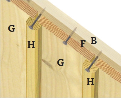 Nu går det snabbt att skruva fast locklisterna (H). Vi håller varje list mot de två-tre streck som vi har ritat och fäster den med en skruv i varje distanslist (F). Skruven ska sitta mellan brädorna (G) och vi använder självborrande skruvar.