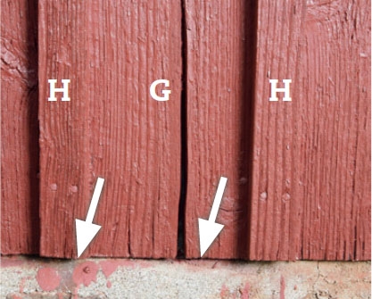 FEL 2: Både panelbrädorna (G) och locklisterna (H) har kapats vinkelrätt nertill, där de ligger an mot stensockeln. Allt regn som rinner ner längs fasaden leds in på sockeln, där ändträet suger åt sig tills det mättas. Det leder till svåra rötskador.