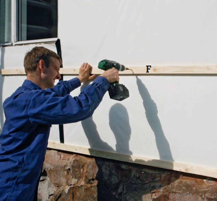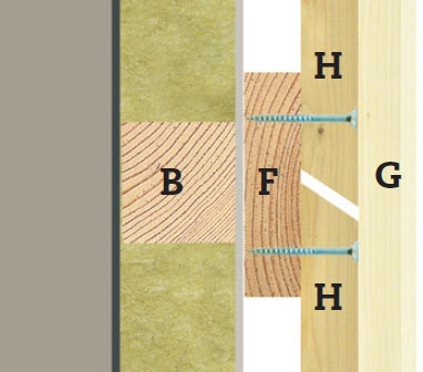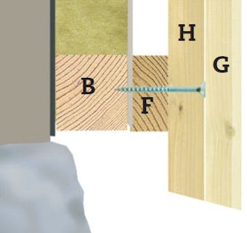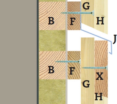De målade brädorna (G) skruvas fast på distanslisterna (F). Varje bräda riktas noga in längs markeringarna innan den fästs med en skruv i varje distanslist. Brädorna har kapats lite för långa för de sågas senare av nertill.