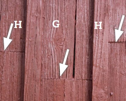 FEL 1: Både panelen (G) och de smala locklisterna (H) spricker för att de har fästs med för många spikar. Varje gång träet drar ihop sig för att det är torrt så förhindrar spikarna det. Locken får aldrig spikas fast på panelen utan ska fästas mellan brädorna.